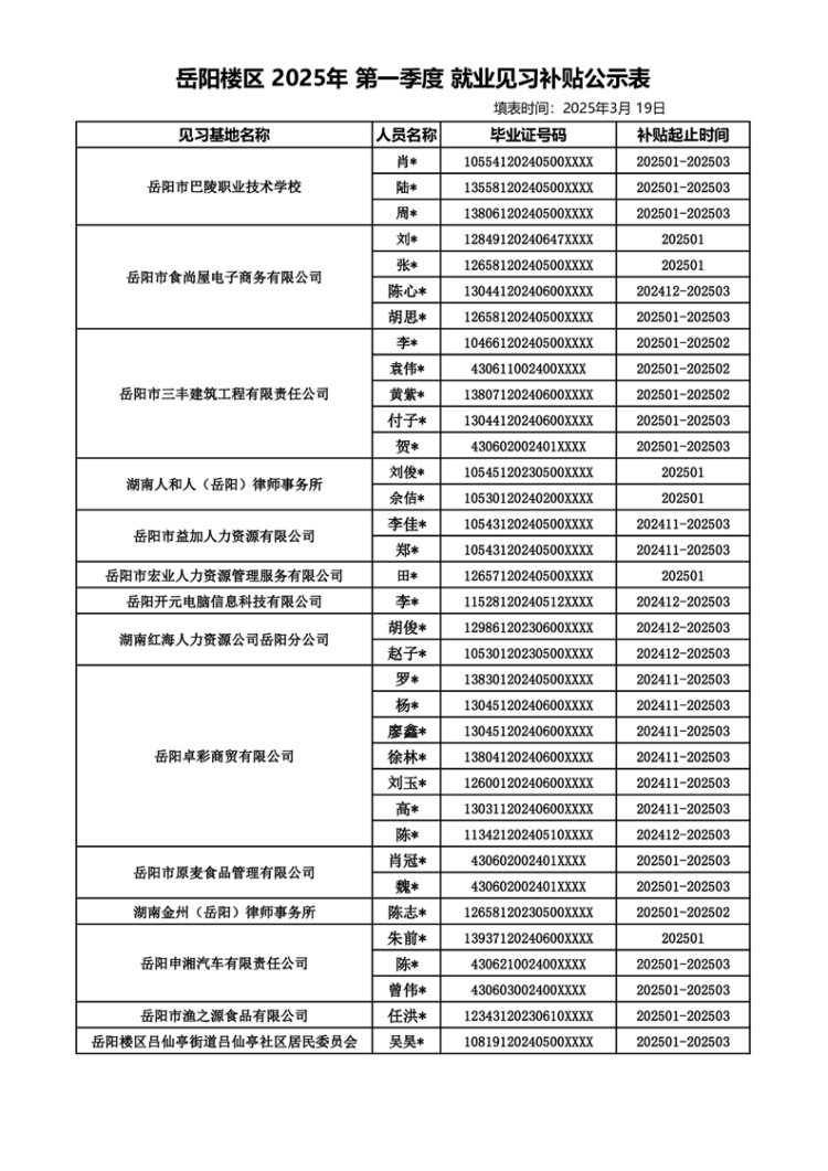 岳阳楼区2025年第一季度就业见习补贴公示表