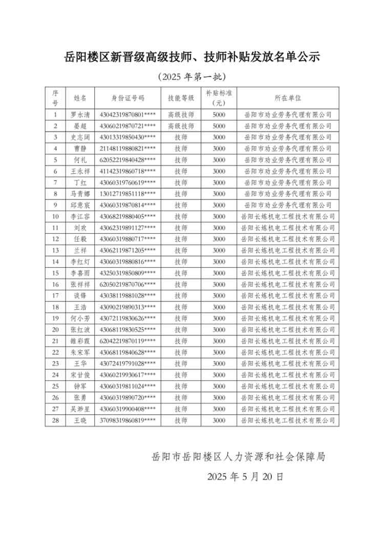 岳阳楼区新晋级高级技师、技师补贴发放名单公示