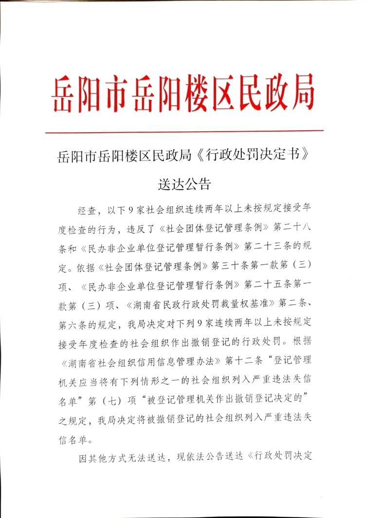 岳阳市岳阳楼区民政局《行政处罚决定书》送达公告