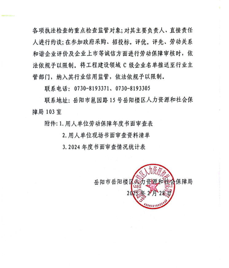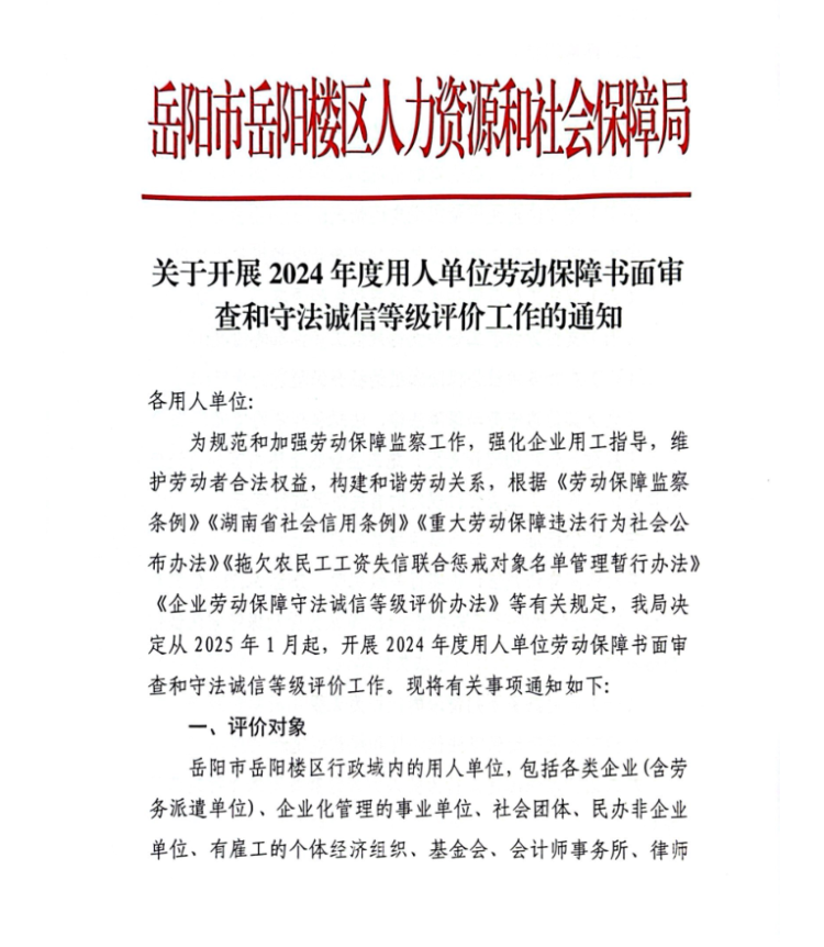 关于开展2024年度用人单位劳动保障书面审查和守法诚信等级评价工作的通知