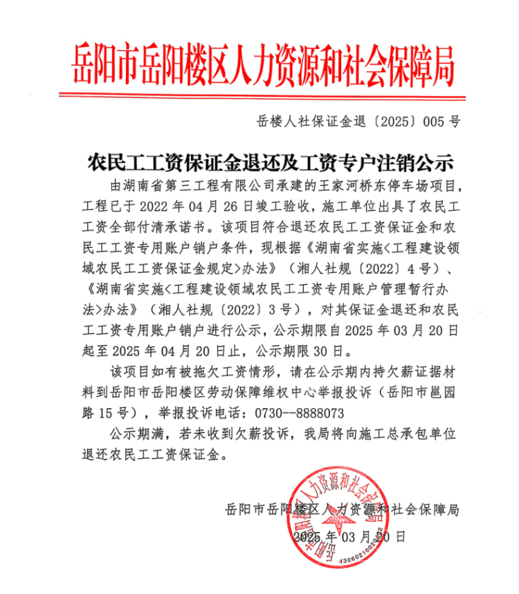 农民工工资保证金退还及工资专户注销公示 岳楼人社保证金退〔2025〕005号