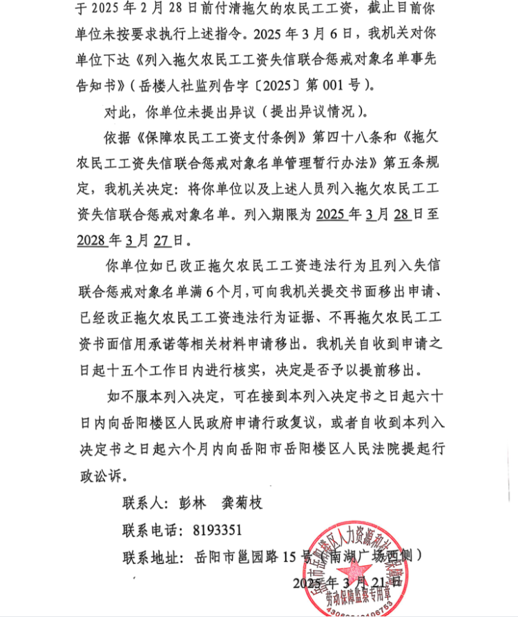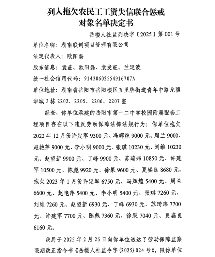 岳阳楼区人力资源和社会保障局关于公布拖欠农民工工资失信联合惩戒对象名单信息的公告