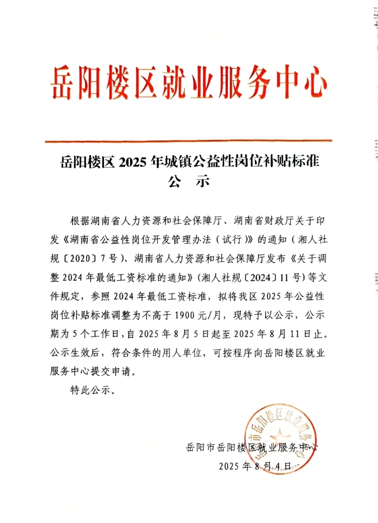岳阳楼区2025年城镇公益性岗位补贴标准