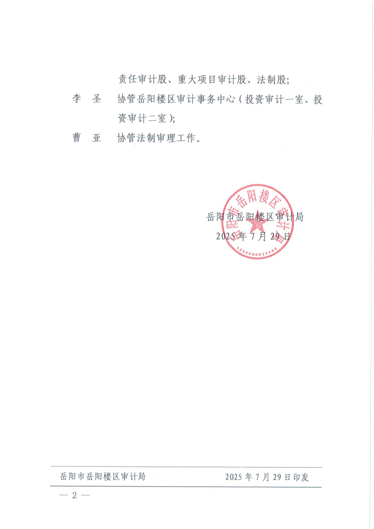 关于调整岳阳楼区审计局领导班子成员及有关同志工作分工的通知(岳楼审〔2025〕1号)