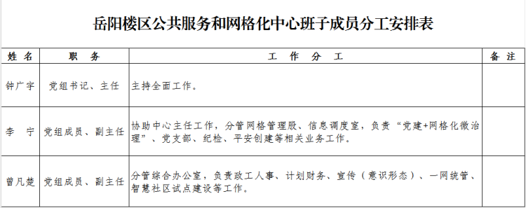 岳阳市岳阳楼区公共服务和网格化中心班子成员分工安排表