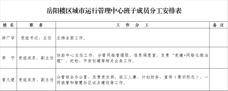 岳阳市岳阳楼区城市运行管理中心班子成员分工安排表