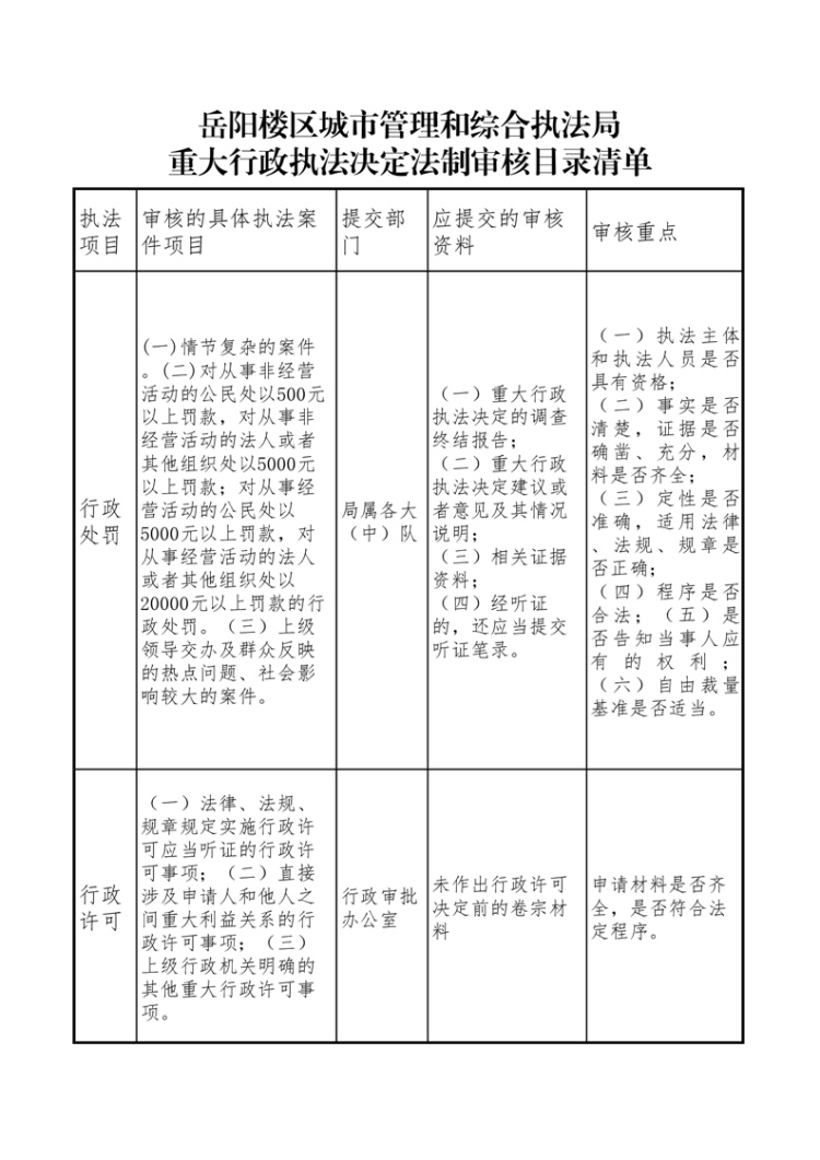 岳阳楼区城市管理和综合执法局重大行政执法决定法制审核目录清单