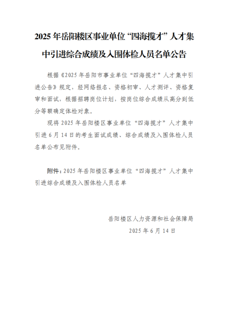 2025年岳阳楼区事业单位“四海揽才”人才集中引进综合成绩及入围体检人员名单公告