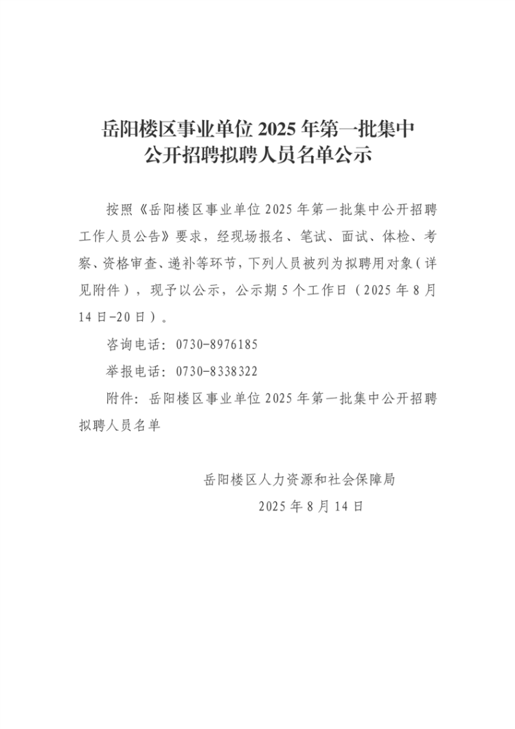 岳阳楼区事业单位2025年第一批集中公开招聘拟聘人员名单公示