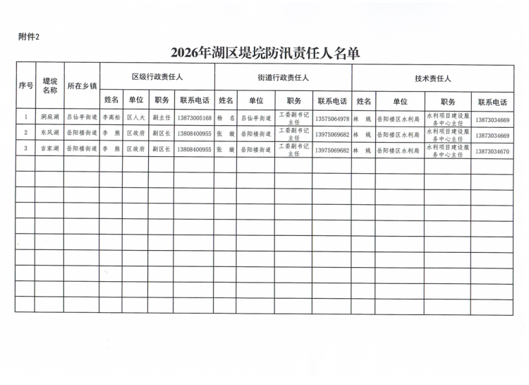 2026年岳阳楼区水库安全四个责任人和湖区堤垸防汛责任人名单