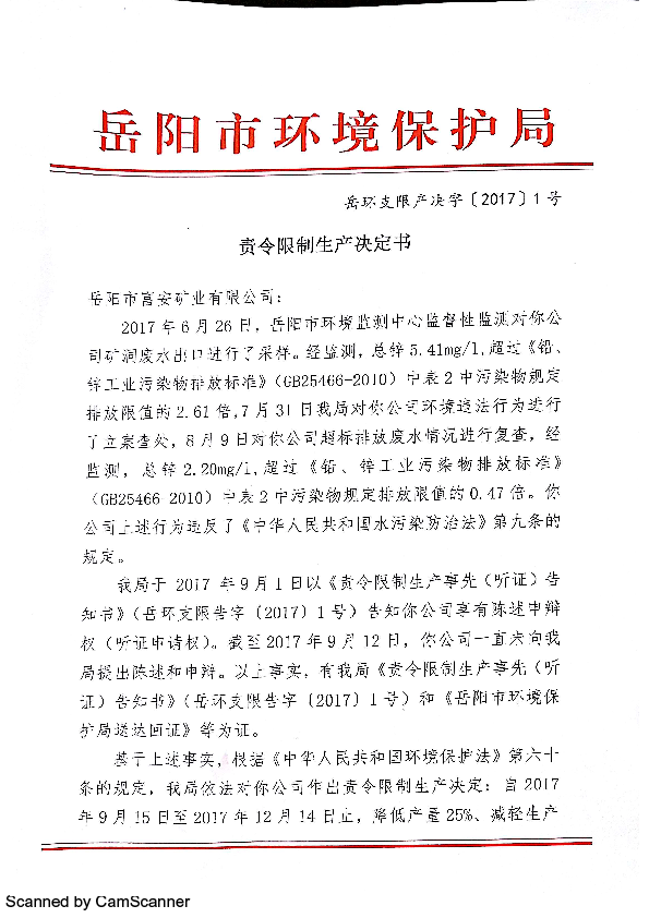 岳环支限产决字[2017]1号