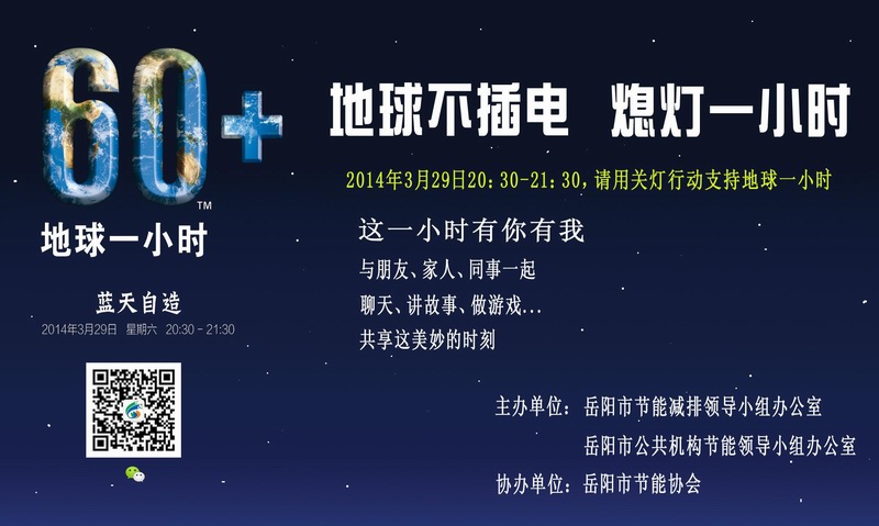 今年3月29日,我市将开展“地球一小时”活动,岳阳市节能减排领导小组办公室、岳阳市公共机构节能领导小组办公室、岳阳市节能协会呼吁广大市民参与当日活动,熄灯一小时。
